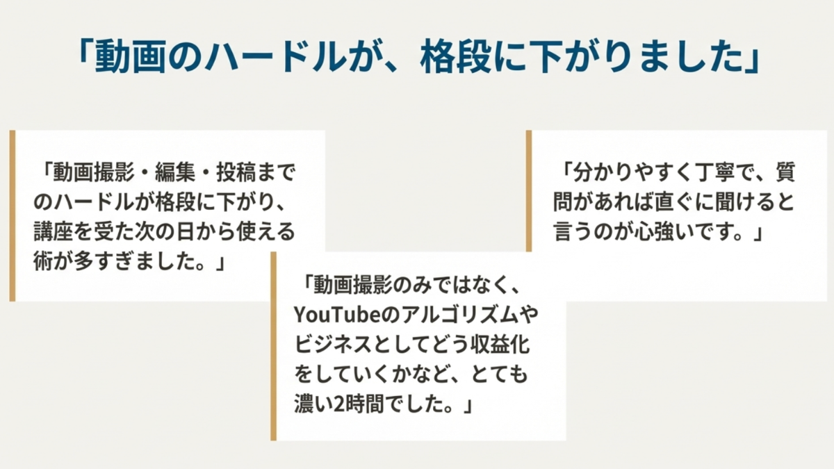 でも、すでに動画をやっていて、 「SNSの何かおかしい」と感じている人には、驚くほど刺さります。